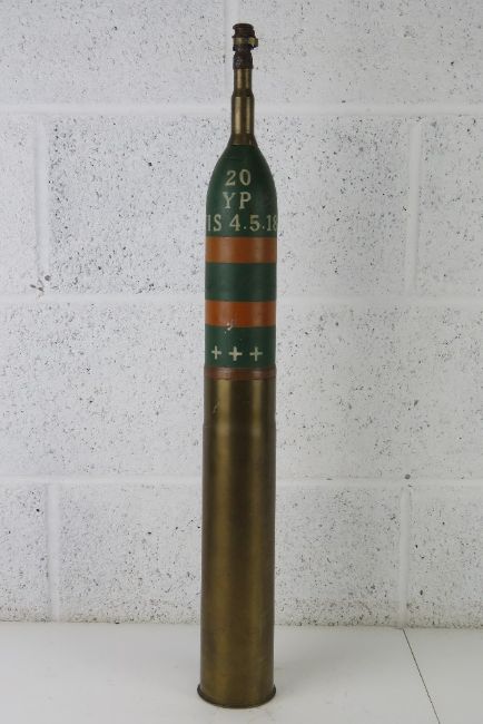 An inert WWI French 75x 370mm Shell, with a HE long fuze, the head has original paint and is dated 1918.