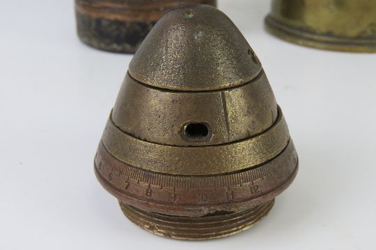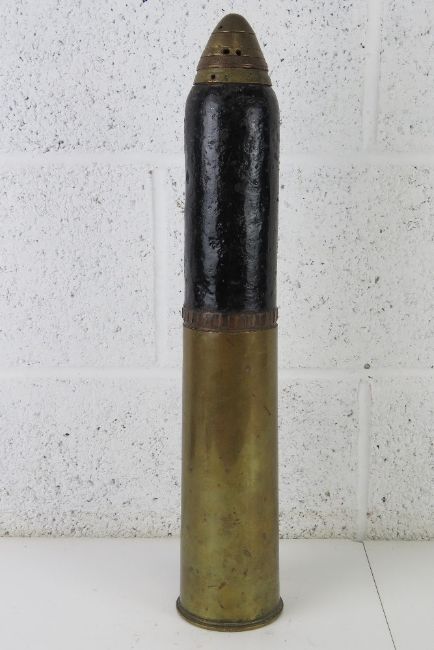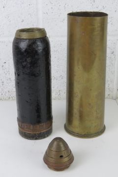 An inert WWI Canadian 18pr shell, dated 1916, the head can be removed from the casing, and the fuze can unscrew, Canadian stamps upon.