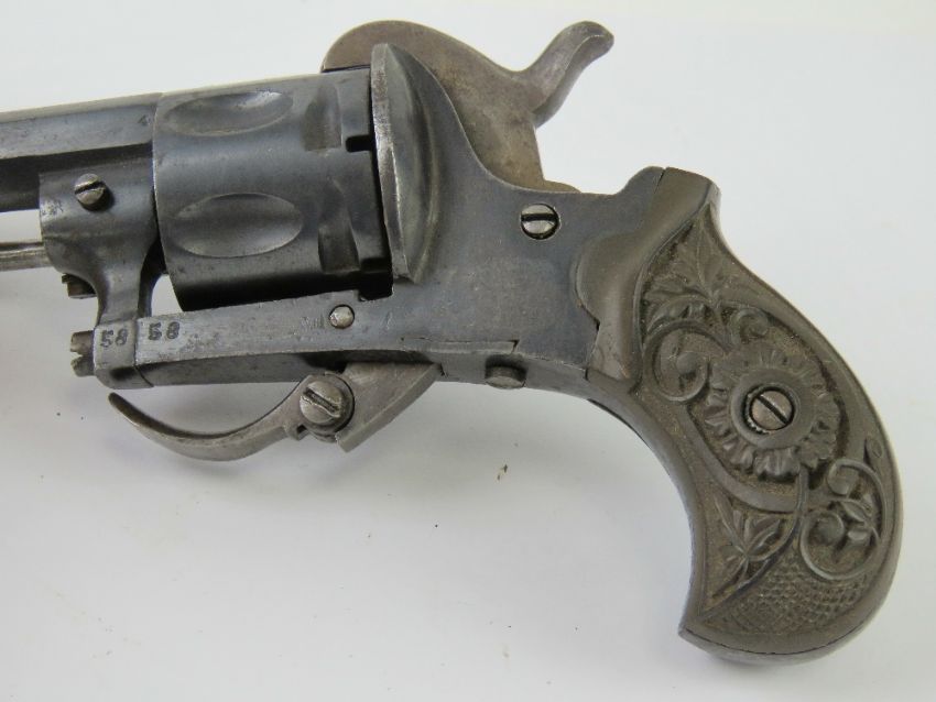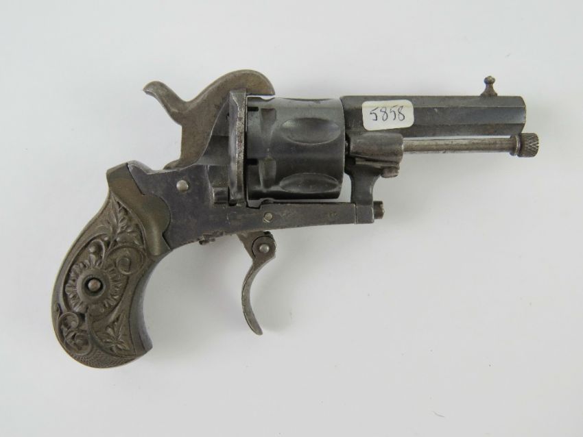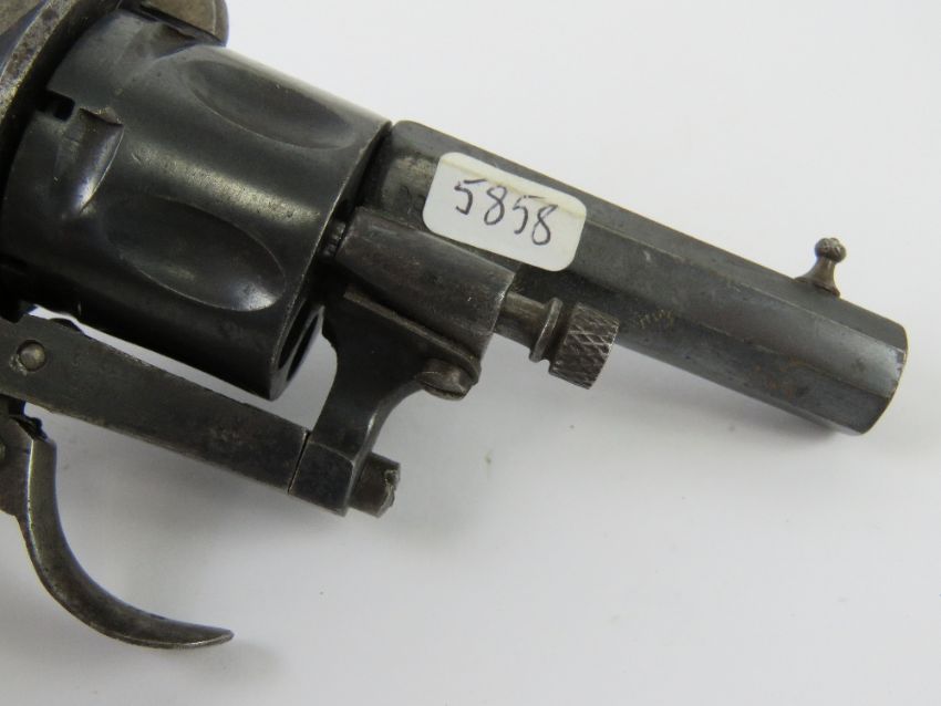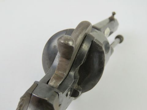 An antique Pinfire 6mm Calibre Revolver with fold down trigger. Full working action, but the trigger return spring is broken. No cert required.