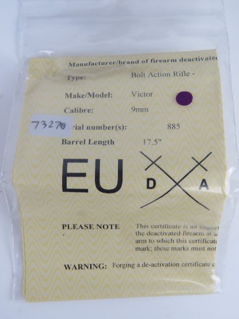 A deactivated Victor 9mm Flobert Bolt Action Garden Gun. The bolt is missing and has had a solid bar welded in place. The magazine is missing. Latest EU Spec. With certificate.