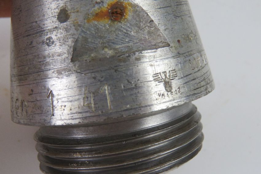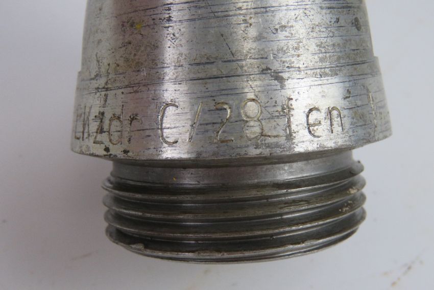 An inert WWII German U-Boat HE shell, shell and head dated 1939, the C/28 fuse is dated 1941 and marked upon.