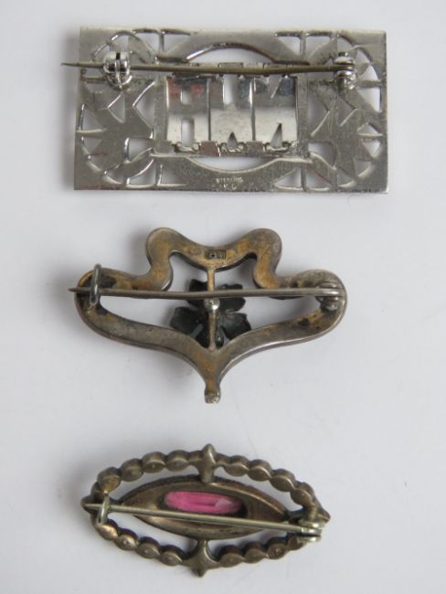 Three vintage silver brooches; a 930 silver continental enamelled brooch, an 800 silver and pink paste brooch, and a Sterling silver and Marcasite square shaped brooch of Art Deco style.