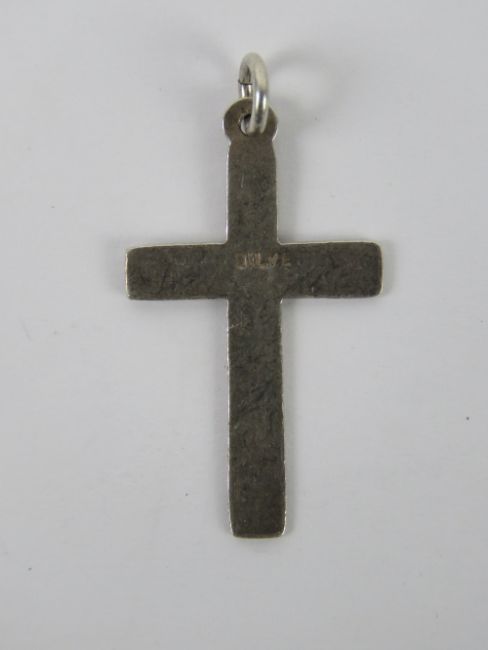 A silver crucifix pendant having scrolling engraving to front, stamped silver, 3.2cm in length inc bale.