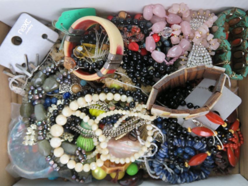 A large quantity of assorted costume jewellery including goldstone bead necklace, rose quartz necklace and bracelets, hardstone bracelets, pearl and shell necklaces, etc