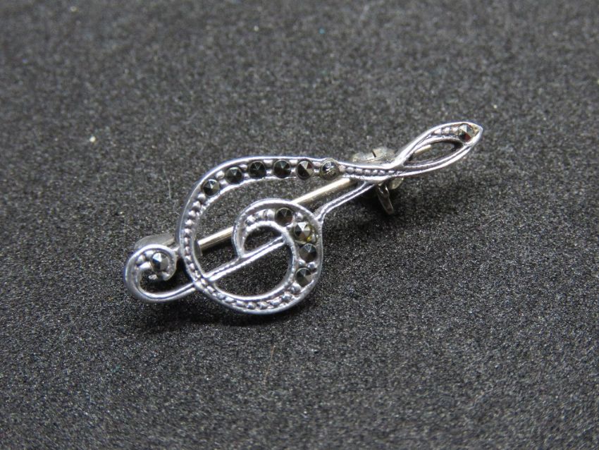 An Art Deco style silver and marcasite music themed brooch in the form of a treble clef.