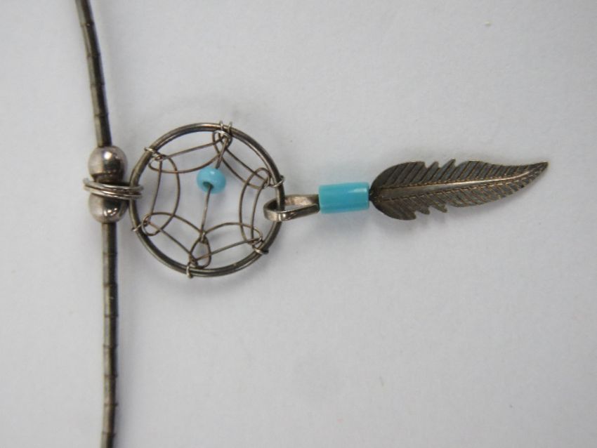 A Native American Navajo style silver and turquoise beaded necklace with dream catcher pendant, stamped 925.
