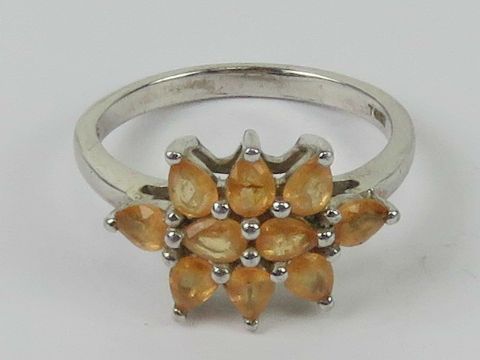 A silver and peach coloured stone cluster ring, stamped 925, size P.