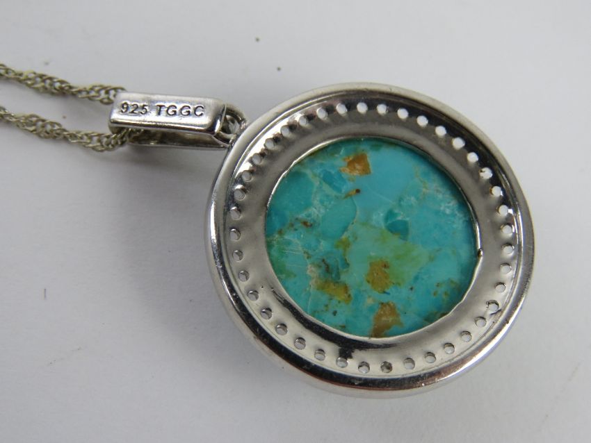 A silver and turquoise pendant having CZ stone surrounding the central cabachon, total diameter 4.7cm, on 18ct gold plated chain.