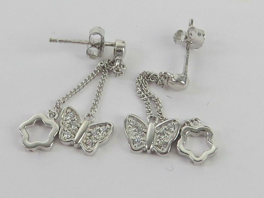 A pair of silver butterfly and floral drop earrings, stamped 925 with 925 silver butterfly backs, in presentation box.
