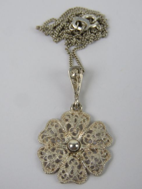 A continental silver floral filigree pendant, stamped 935 and measuring 2.1cm inc bale, on silver chain.