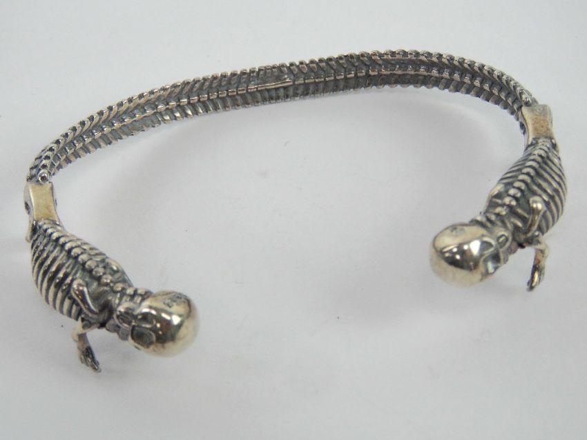 A silver Gothic bangle having skull terminals and bone / spine design throughout, stamped 925 and dated 2013.