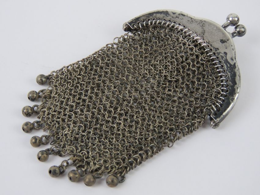 A white metal chain link purse having chain loop handle, no apparent hallmarks, approx 7.5 x 4.5cm.