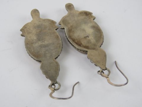 A pair of large silver earrings having central green oval panel and acanthus style decoration, stamped 925, 6.3cm drop.
