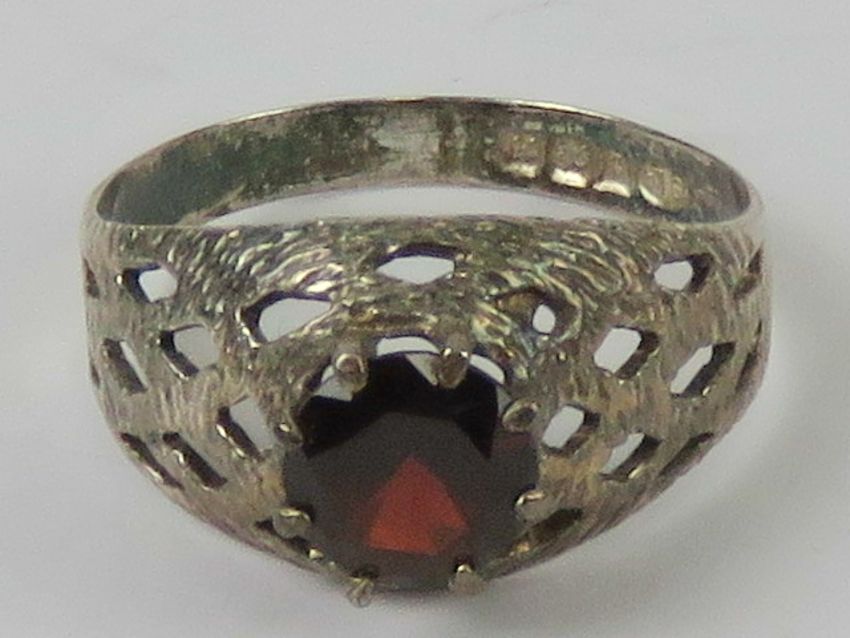 A HM silver red stone ring, pierced lattice design, hallmarked for Birmingham, size O-P.