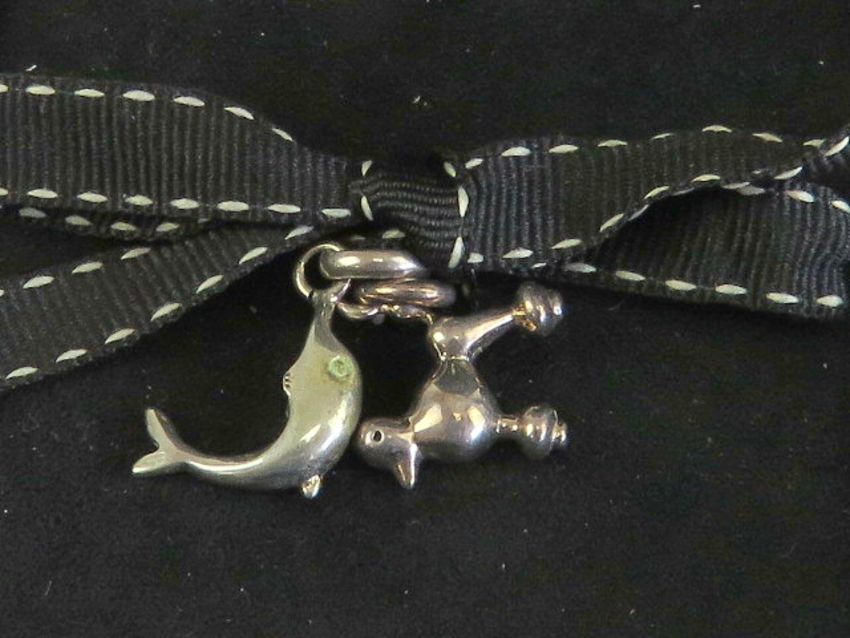 Links of London; two silver charms having Links hallmark upon in the form of a dolphin and a poodle. In presentation box.