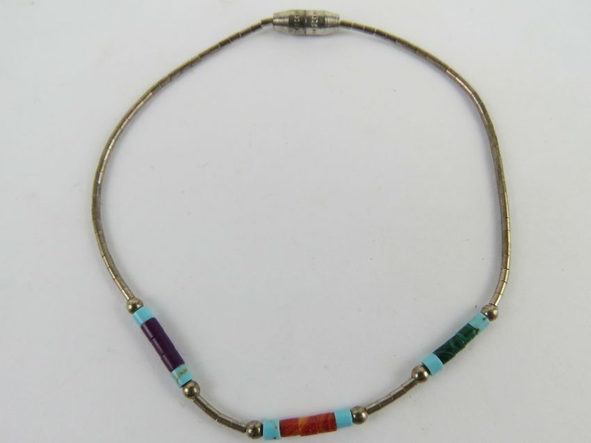 A Native American style turquoise coloured stone and silver beaded bracelet.