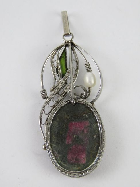 A handmade filigree floral pendant having large purple stone, 5.5cm inc bale.