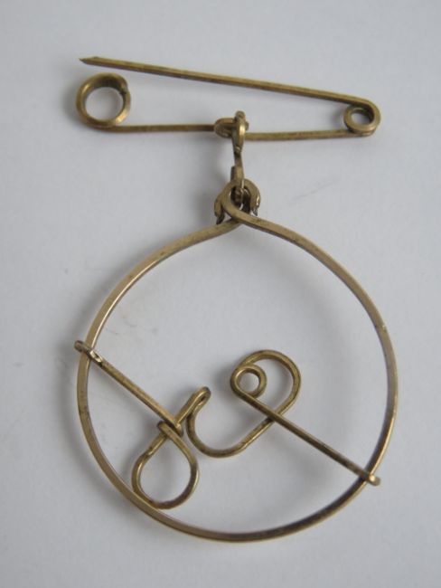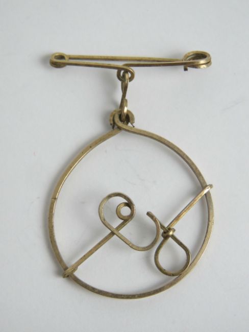 A vintage yellow metal brooch 'G' within circle suspended below safety pin style bar, 2.7cm wide.