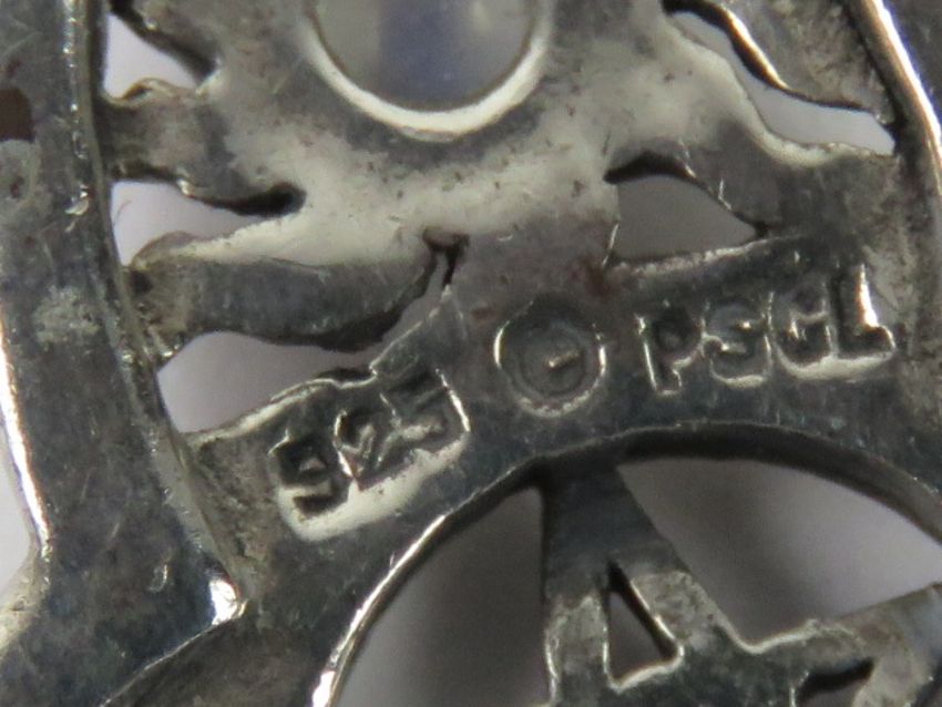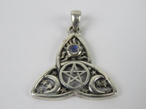 A silver Wiccan pentagram, crescent and moonstone pendant, stamped 925 and measuring 2.7cm wide.