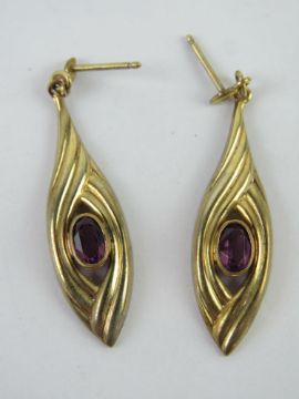 A pair of yellow metal earrings having central oval cut amethysts, no apparent hallmarks, 2.1g.