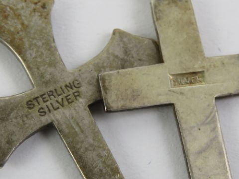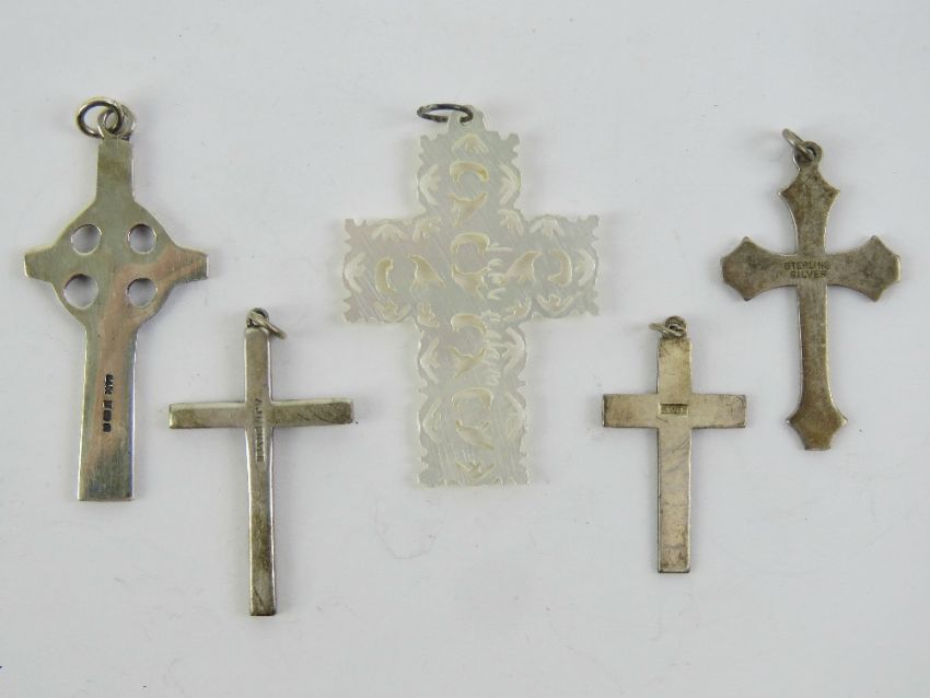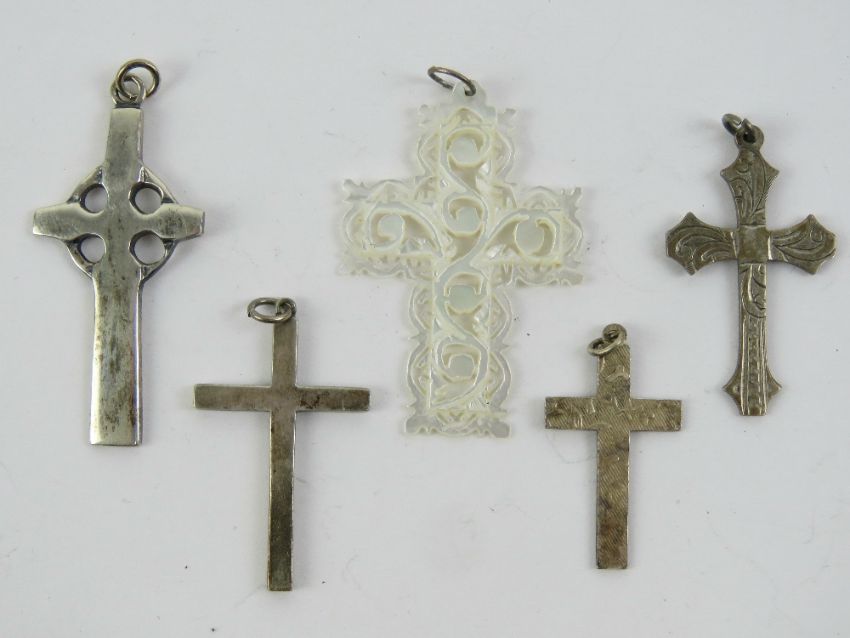 Four silver crucifix and Celtic cross pendants, together with a mother of pearl carved and pierced pendant.