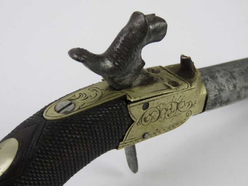 An antique .40 Calibre Percussion Derringer with a concealed, flip down trigger that pops out when the hammer is at full cock. No cert required.
