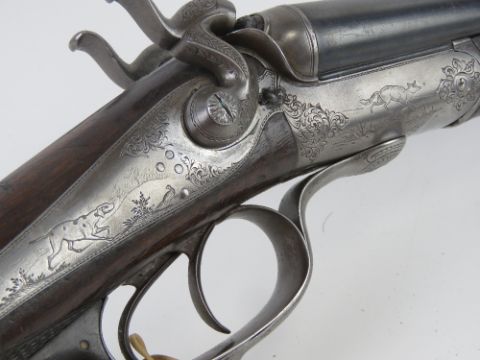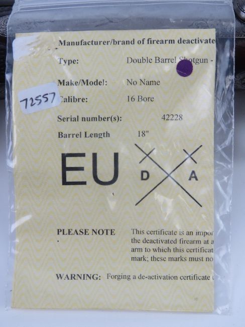 A deactivated French High Quality Canons Acier Double Barrel 16 Gauge Hammer Coach Gun with 18 inch barrels and leather sling. Latest EU spec moving triggers, hammers, and break open action. With certificate.