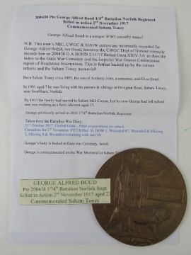 A WWI Death Penny for George Alfred Boud. Pte. 200438 1st/4th Bat. Norfolk Regiment KIA 2/11/1917.