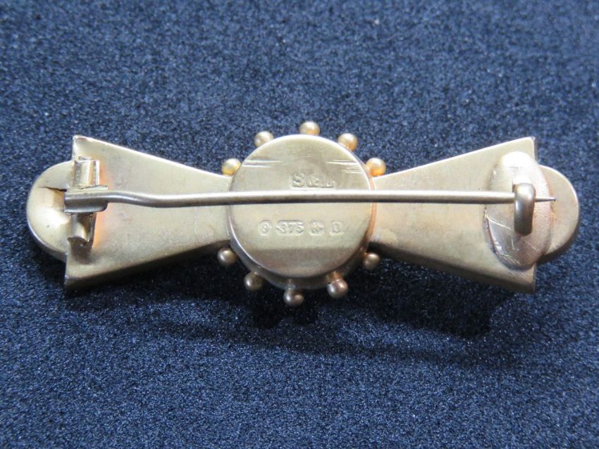 A 9ct gold brooch having central seed pearl and floral pattern upon, hallmarked 375, 3.4g.