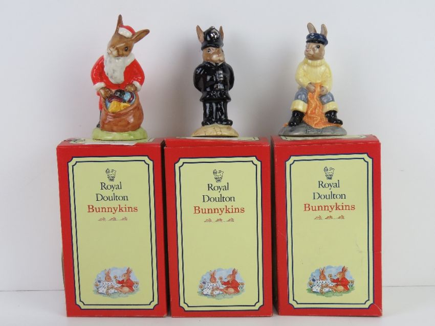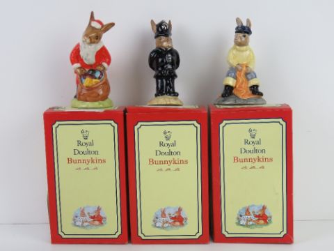Royal Doulton Bunnykins; Seven figurines in original boxes being 'Santa', 'Easter Greetings', 'Policeman', Bath Time', 'Fisherman', Mother' and 'Sightseer' (with Exclusive Member Only certificate).