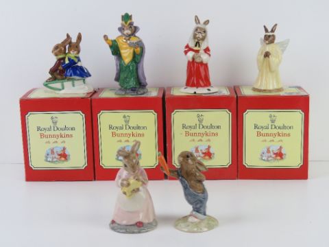 Royal Doulton Bunnykins; Four figurines in original boxes being 'Angel', 'Judge', 'Mystic' (Millennium 200 Year piece) and 'Billie and Buntie Sleighride' (associated box). Also two Bunnykins figures without boxes being 'Mother's Day' and 'Mother and Babies'. Six items in total.