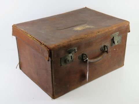 An antique silk lined leather travelling case, slightly a/f, with twin locks, measuring 51 x 35 x 28cm.