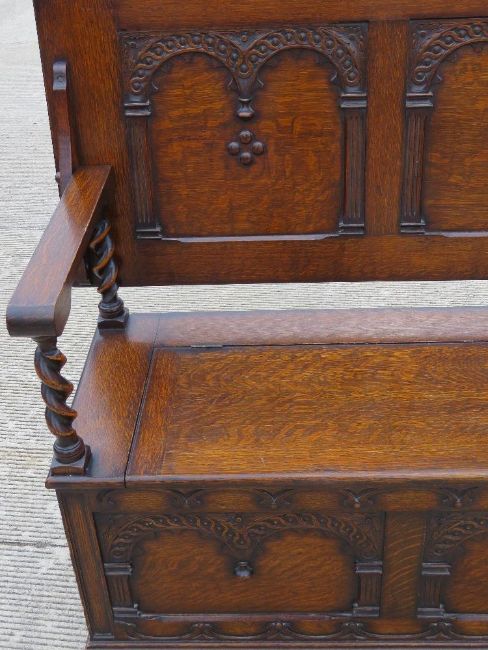 A c 1930s oak fold over monks bench, seat lifting to reveal compartment within, 106 x 102 x 52cm.