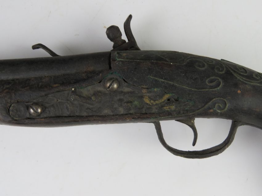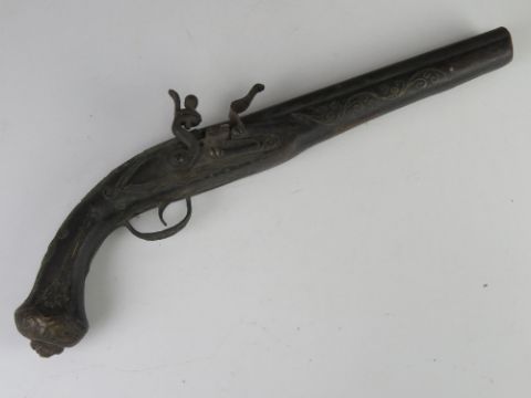 An antique pistol cocks and fires but a/f, probably Indian, total length approx 43cm.