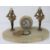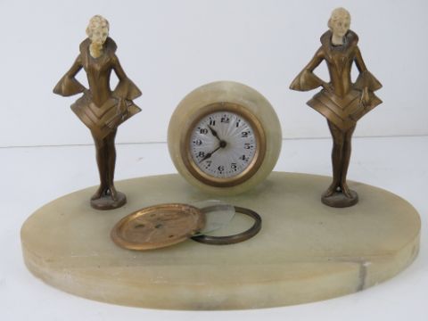 An art deco onyx desk clock having central garniture a/f flanked by two female figurines (a/f) with pen tray to front. 28cm wide.