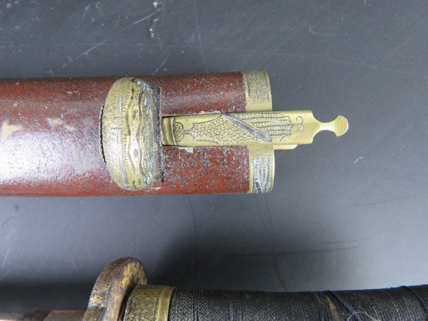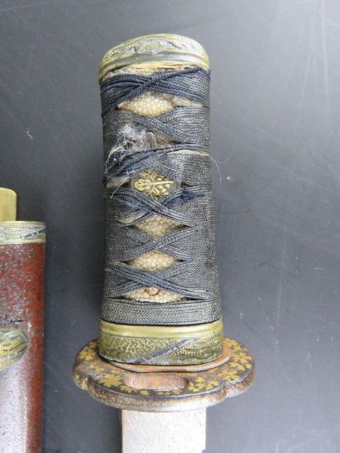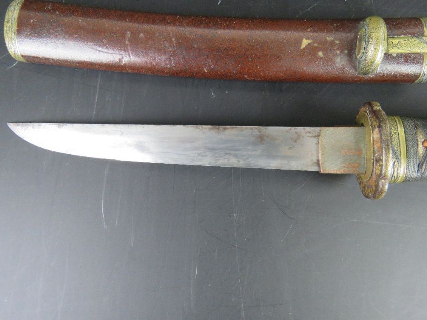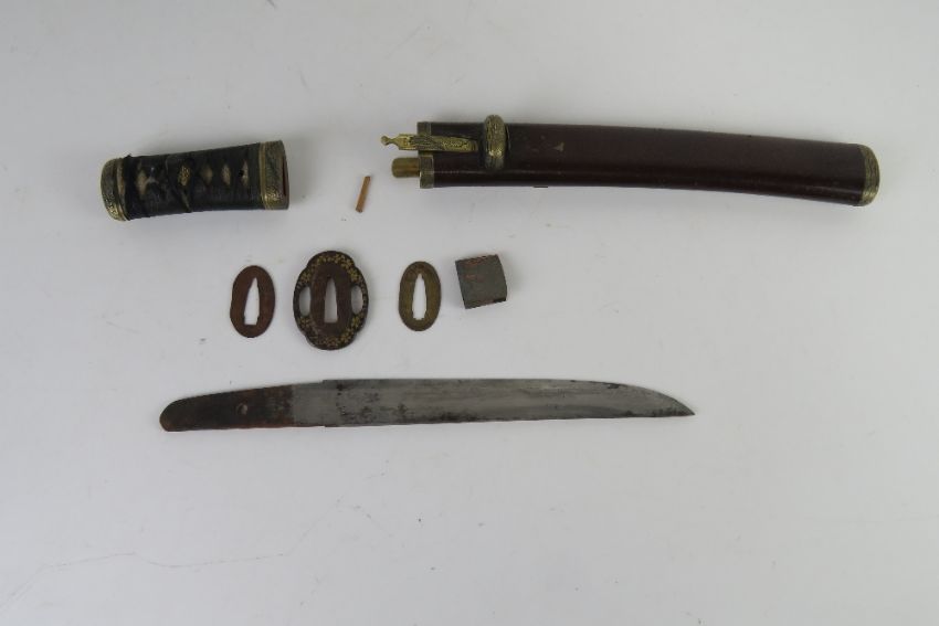 An antique Japanese Tanto with cord-covered tsuka, brass and silver fuchi and kashera, in brown lacquered brass-mounted saya, matching kodsuka and kogai blade, 21cm long. Unsigned.