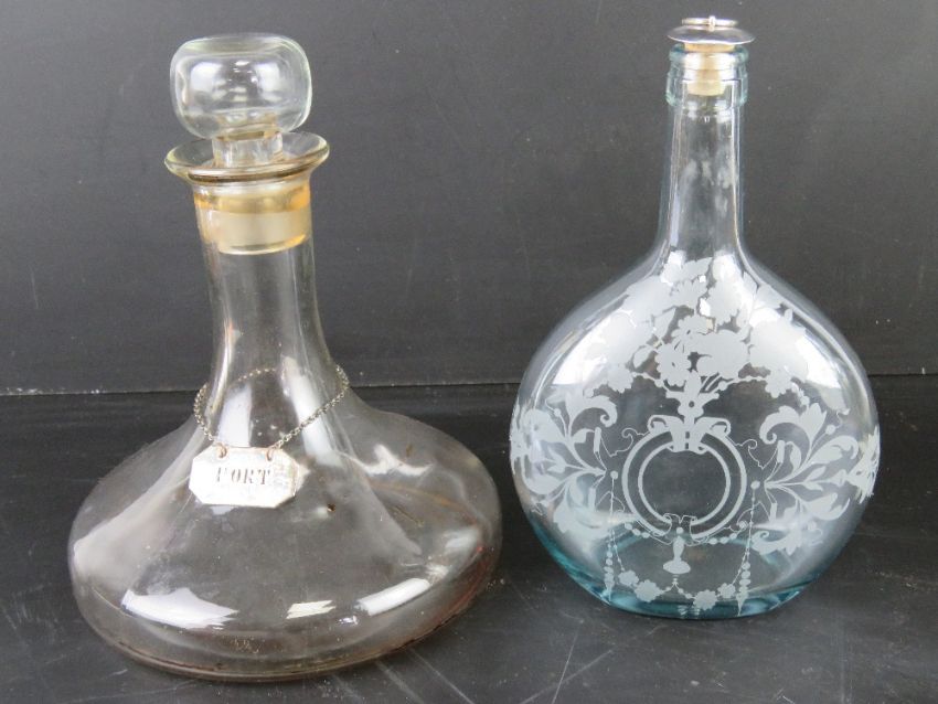 A ruby glass decanter with clear glass stopper together with a quantity of other decanters and three silver plated labels.