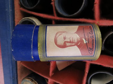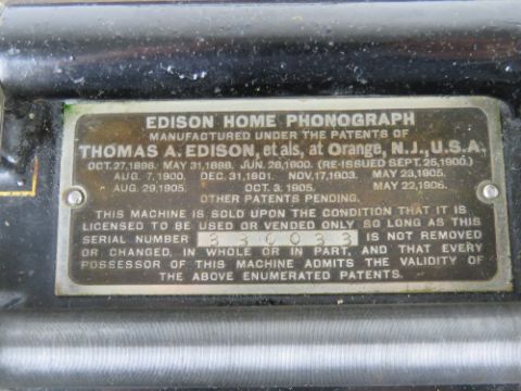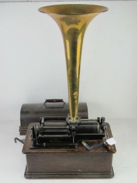 An Edison Home Phonograph bearing serial number 330033 dating to c1906, brass horn measuring 46 x 24cm. With ten assorted wax cylinders in case. Phonograph measuring 41 x 22cm.