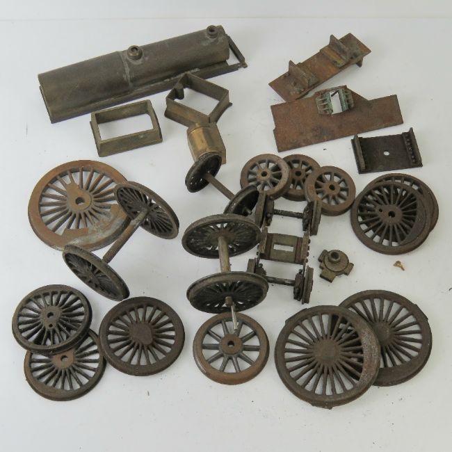 A quantity of assorted 2 1/2" and other live model steam railway wheels and parts.