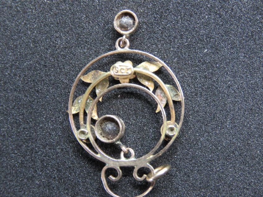 A late Victorian early Edwardian 9ct gold amethyst and seed pearl pendant, stamped 9ct.