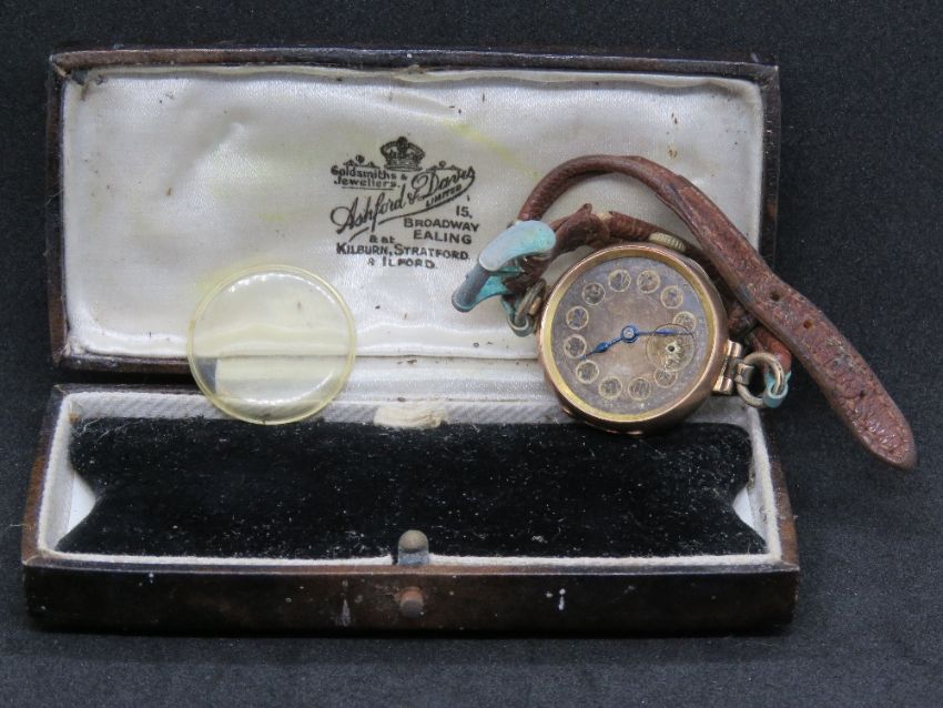 A vintage 9ct gold watch, a/f glass replaced with plastic, hallmarked 375, with vintage box.