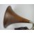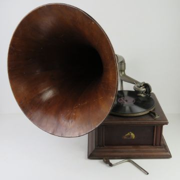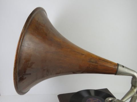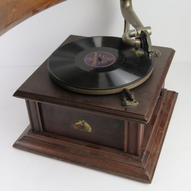 An HMV table top wind up gramophone with handle, wooden detachable horn and gramola stylus. Gramaphone 32 x 32cm, horn 52 x 46cm.