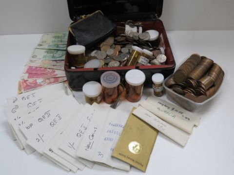 A very large quantity of 20thC British and World coinage within black painted cash box.