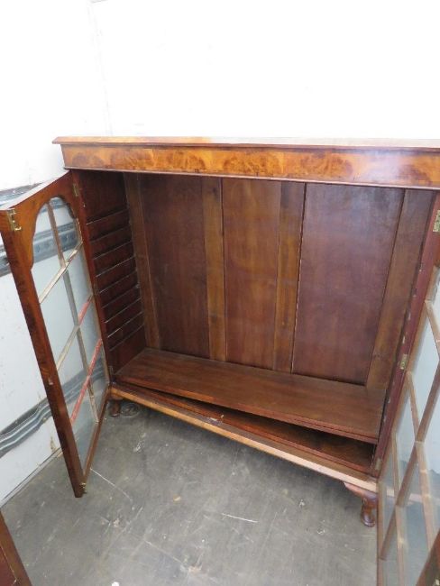 A fine Edwardian walnut twin glazed door bookcase raised over short cabriole legs, doors opening to reveal three adjustable shelves within, 122 x 34 x 128cm.