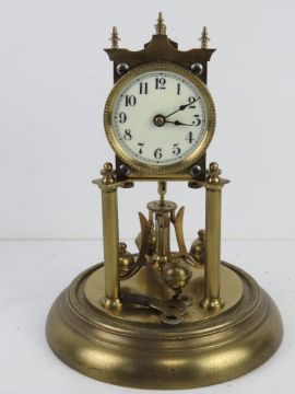 A brass mantel clock in glass dome having enamel dial, with key, all standing 31.5cm high.