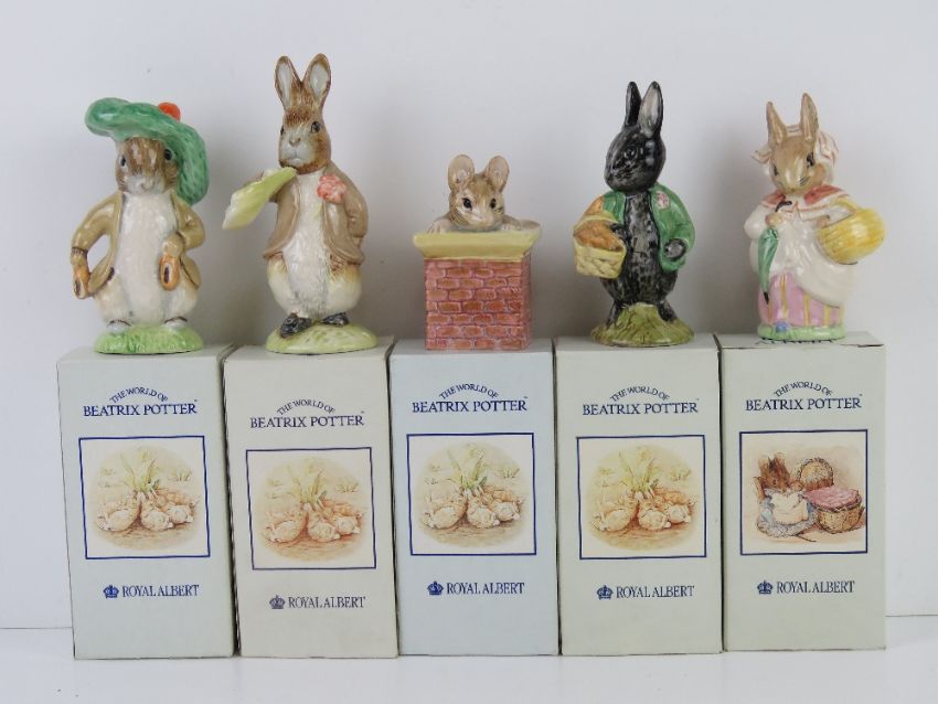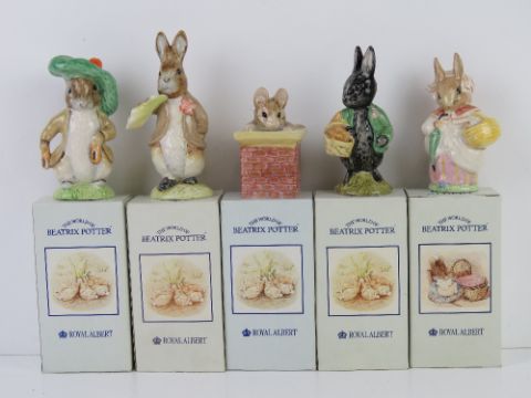 Royal Albert Beatrix Potter; eight figurines with associated boxes being 'Mrs Rabbit', 'Little Black Rabbit', 'Tom Thumb', 'Benjamin Ate a Lettuce Leaf', 'Benjamin Bunny', 'Fierce Bad Rabbit', 'Mrs Flopsy Bunny' and 'Cottontail'.