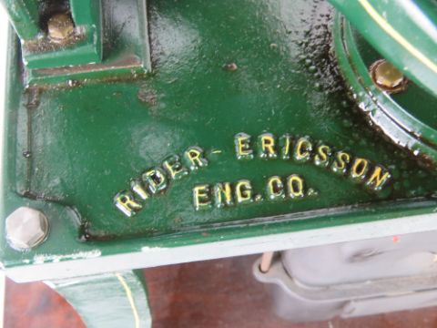 A Rider-Ericsson precision vertical hot air pumping engine having 9" spoked fly wheel, finished in green and yellow, marked 'RIDER-ERICSSON, ENG CO' in relief, approx 38cm high raised on wooden base 48cm wide.Does not have a boiler certificate.