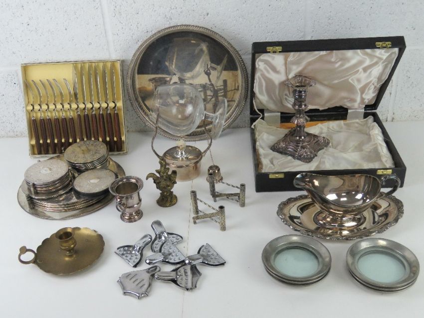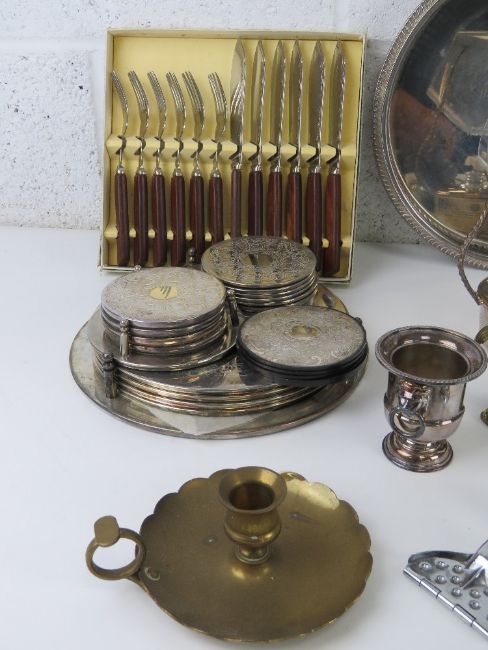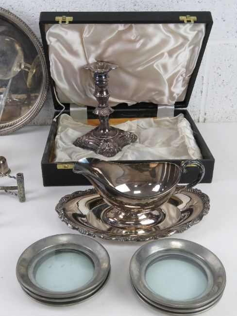 A quantity of silver plated wares inc brandy warmer, coasters, sauce boat, candlestick, trays, etc. Also some other metalware inc brass chamber stick and a boxed fish knife and fork set.