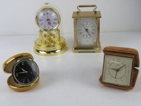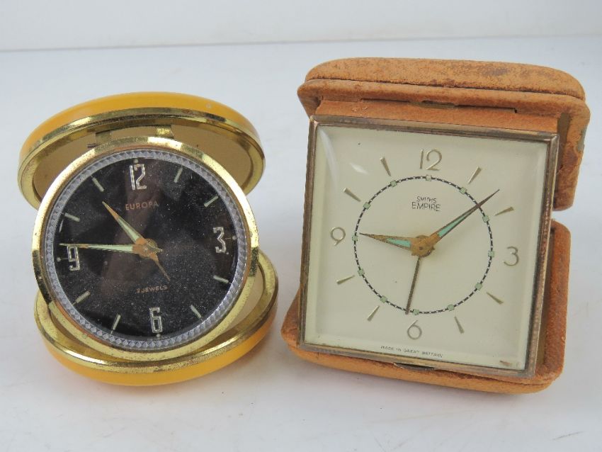 A Smiths Empire travel clock together with another travel clock and two small mantel clocks. Four items.