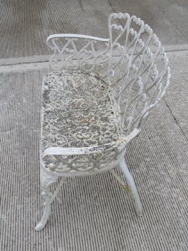 A white painted cast metal two seated garden bench, legs united by X shaped stretcher, 96cm wide.